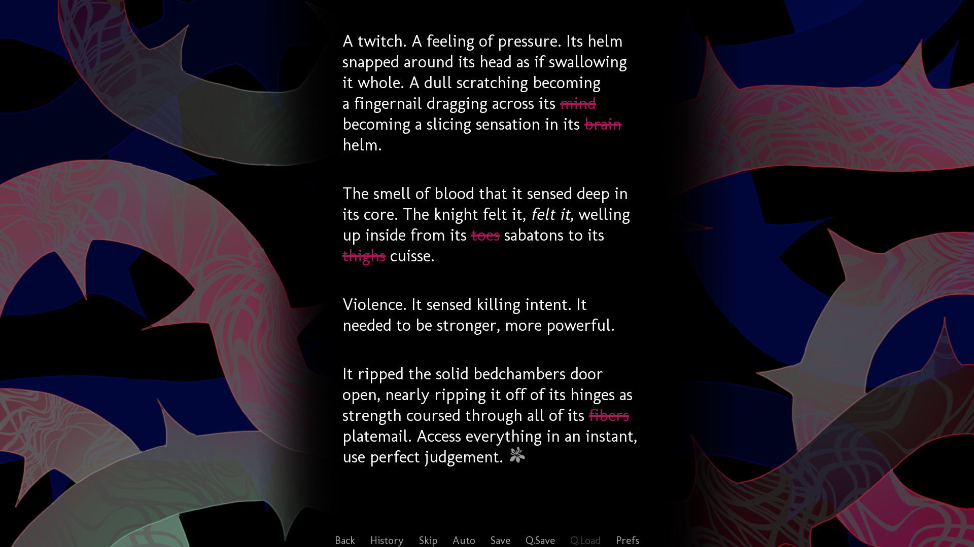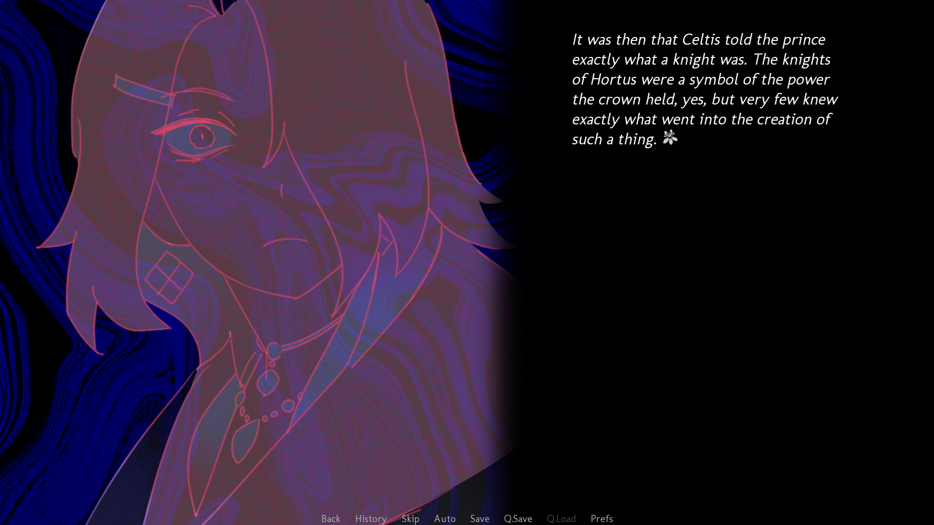 The Tale of the Cloistered Crown is a 21k word kinetic visual novel for the Once Upon a Time VN Jam about a Prince and his Knight. This tale is not intended for children. As such, one should read with discretion.