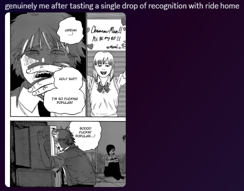 I felt a little bit like Denji hiding out with Kishibe and Kobeni; toast with any kind of jam I wanted was nice, but now I wanted five, no, ten girlfriends. I had gone from having a very legitimate fear of an old stalker seeing my public work to starving to be seen again and more than last time. And that, reader, is a complete betrayal of what I wanted when I started making VNs.